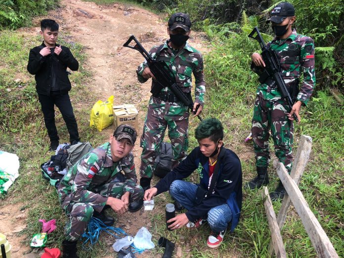 ENTIKONG- Tim Pos Pamtas Panga DPP mengamankan dua orang pelintas batas ilegal. Dua orang yang diamankan petugas masing-masing 1 orang juklan dan 2 orang sindikat pengojek ilegal yang didapati membawa empat kantong pil ekstasi yang bersikikan kurang lebih 495 butir pil ekstasi siap edar yang merupakan golongan satu di jalan tikus wilayah pos Pamtas Panga.