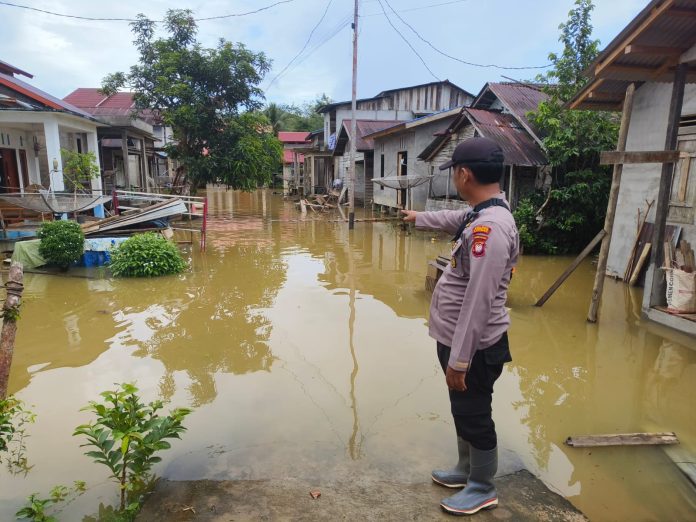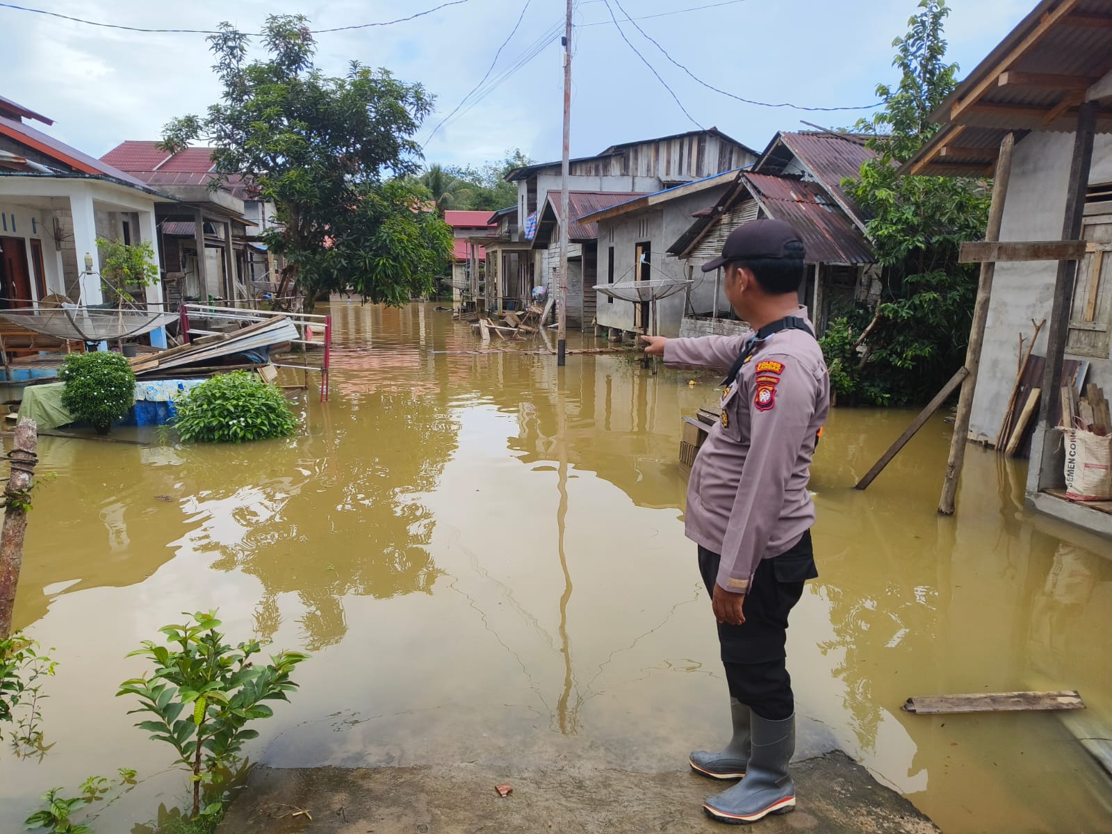 Untuk memastikan arus lalu lintas dilokasi banjir dapat dilalui, anggota Kepolisian Sektor Menyuke dikerahkan langsung ke lapangan.