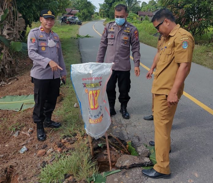 Kapolsek Menjalin didampingi pihak desa saat memantau gorong-gorong rusak di ruas jalan Dusun Tanjam