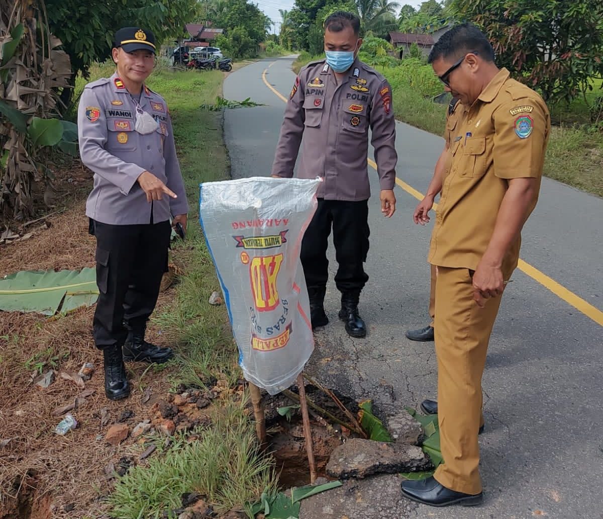 Menyikapi laporan warga tersebut, Kapolsek Menjalin Iptu Suwandi didampingi anggota bersama staf desa setempat pun langsung meninjau lokasi gorong-gorong yang rusak tersebut.
