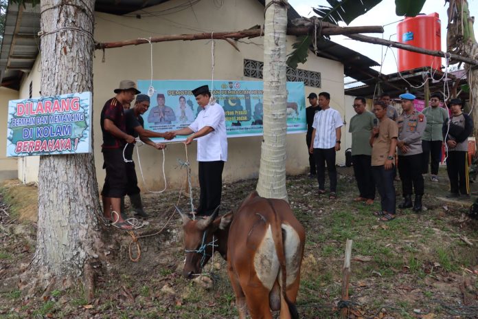 LANDAK – Dalam rangka merayakan hari raya Idul Adha 1446 hijriah, Polres Landak menyerahkan sekaligus melakukan pemotongan hewan qurban yang dilaksanakan di halaman Mapolres Landak, Senin (17/06/2024).