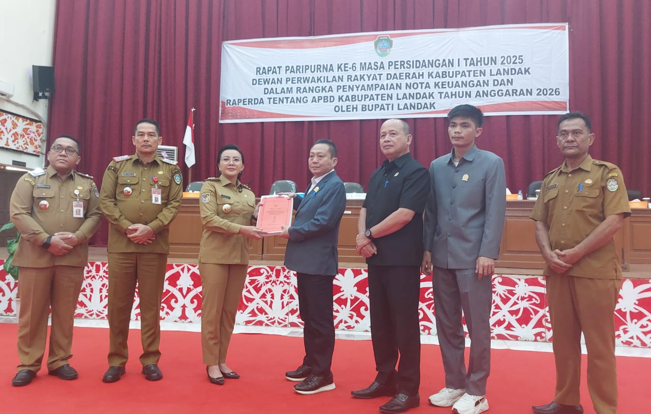 LANDAK – Bupati Landak, Karolin Margret Natasa, menyampaikan pidato pengantar nota keuangan dan Rancangan Peraturan Daerah (Raperda) tentang Anggaran Pendapatan dan Belanja Daerah (APBD) Kabupaten Landak Tahun Anggaran 2026 dalam rapat paripurna ke-6 masa persidangan ke-1 Tahun 2025 di Aula DPRD Landak, Senin (3/11/2025).