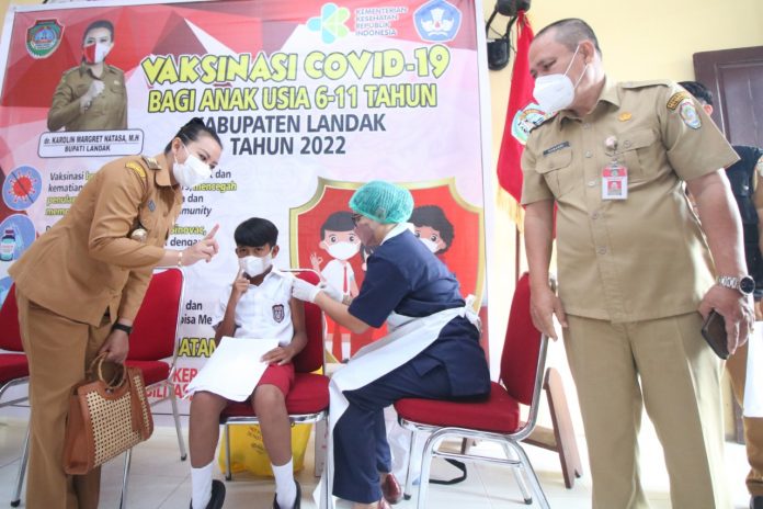 Bupati Landak Karolin Margret Natasa mengatakan bahwa Kabupaten Landak melakukan Vaksinasi 500 anak pada peluncuran Vaksinasi COVID-19 serentak se-Kalimantan Barat dengan target sasaran 42.189 anak harus tervaksinasi.