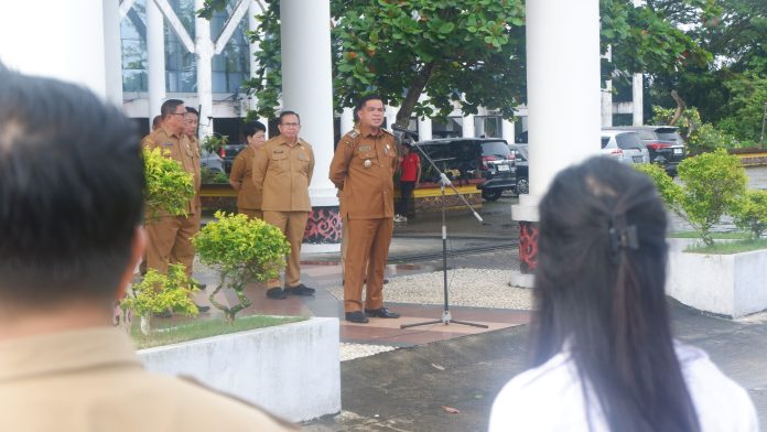 LANDAK – Hari pertama masuk kerja usai libur lebaran, Pemerintah Kabupaten Landak menggelar apel pagi di halaman Kantor Bupati Landak guna mengecek kesiapan ASN Pemkab Landak dalam melaksanakan tugas.