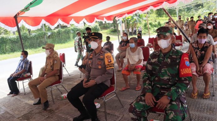 SENGAH TEMILA- Danramil 1201-09/Sengah Temila Letda Arm Suwandi mendampingi Bupati Landak Karolin Margret Natasha menyerahkan bantuan CSR PT. Bank Kalbar kepada pedagang UMKM di Pasar Rakyat Gunung Seha’ Tarigas Desa Aur Sampuk Kecamatan Sengah Temila, Selasa (8/6/2021).