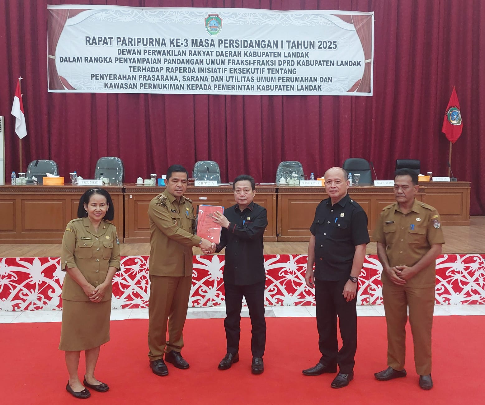 LANDAK – Dewan Perwakilan Rakyat Daerah (DPRD) Kabupaten Landak menggelar Rapat Paripurna ke-3 Masa Persidangan I Tahun 2025 dengan agenda penyampaian pandangan umum fraksi-fraksi terhadap Rancangan Peraturan Daerah (Raperda) inisiatif eksekutif tentang penyerahan prasarana, sarana, dan utilitas umum (PSU) perumahan serta kawasan permukiman kepada Pemerintah Kabupaten Landak.