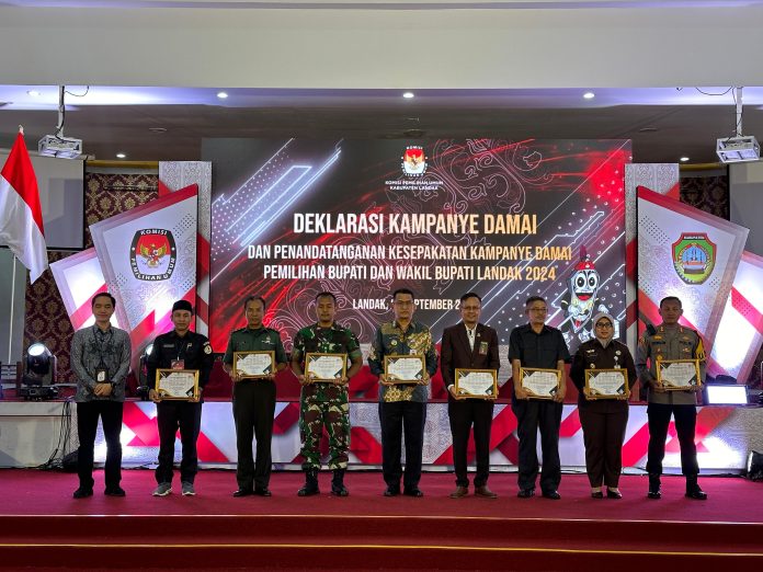 LANDAK – Pj. Bupati Landak Gutmen Nainggolan menghadiri acara deklarasi kampanye damai pemilihan Bupati dan Wakil Bupati Kabupaten Landak dan penandatanganan kesepakatan kampanye damai, bertempat di Aula Besar Kantor Bupati Landak, Senin (23/09/2024).