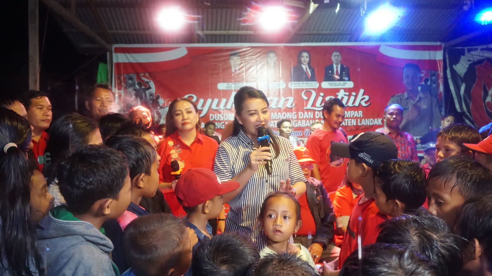 LANDAK – Bupati Landak periode 2017-2022 Karolin Margret Natasa bersama Anggota Dewan Perwakilan Rakyat Republik Indonesia (DPR RI) Fraksi Partai Demokrasi Indonesia (PDI) Perjuangan Daerah Pemilihan Kalimantan Barat 1 Cornelis serta didampingi Anggota Dewan Perwakilan Rakyat Daerah (DPRD) Provinsi Kalimantan Barat Daerah Pemilihan Kabupaten Landak Angeline Fremalco, Camat Ngabang, Kepala Desa Rasan dan Kepala Desa Mungguk mengunjungi Desa Sungai Kelik dalam rangka menghadiri kegiatan syukuran atas masuknya listrik di Desa Sungai Kelik, Kecamatan Ngabang, Kabupaten Landak, sabtu (14/10/2023) malam.