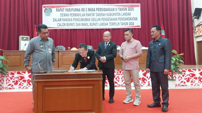 LANDAK – Dewan Perwakilan Rakyat Daerah (DPRD) Kabupaten Landak menggelar rapat paripurna ke-3 masa persidangan II Tahun 2025 dengan agenda pengumuman usulan pengesahaan pengangkatan calon Bupati dan Wakil Bupati Landak terpilih Tahun 2024, Kamis (16/01/2025).