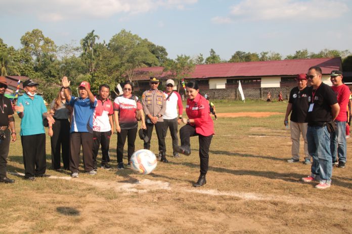 NGABANG- Bupati Landak periode 2017-2022 Karolin Margret Natasa membuka secara resmi turnamen sepak bola Open Tournament ANKAR 103 Cup dalam rangka memperingati Hari Ulang Tahun (HUT) Kemerdekaan Republik Indonesia ke – 78 yang bertempat di Stadion Karya Bhakti 85, Desa Karangan, Kecamatan Mempawah Hulu, Kabupaten Landak, sabtu (12/08/2023).
