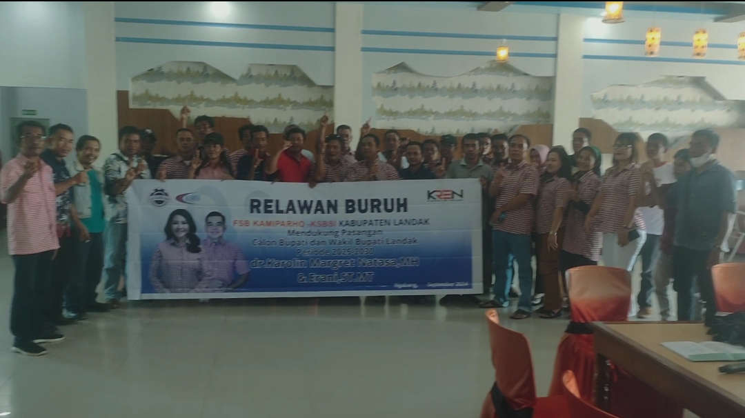 LANDAK – Federasi Serikat Buruh Makanan Minuman Pariwisata Restoran Hotel dan Tembakau (FSB Kamiparho)-Konfederasi Serikat Buruh Sejahtera Indonesia (KSBSI) Kabupaten Landak mendeklarasikan dukungan kepada pasangan calon Bupati dan Wakil Bupati Landak nomor urut 1, Karolin-Erani atau Pasangan KREN di Ngabang, minggu (06/10/2024).
