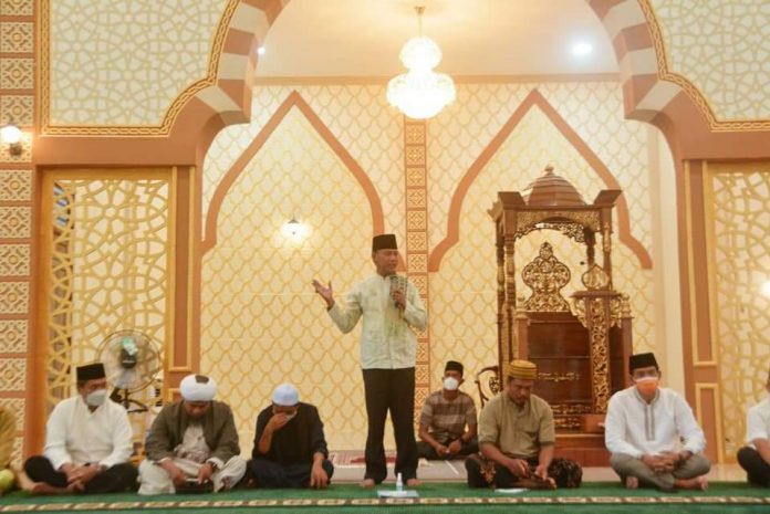 KETAPANG- Wakil Bupati Ketapang Farhan menyerahkan bantuan kepada Masjid Manarul Huda Pematang Gadong yang merupakan rangkaian dari Safari Ramadhan 1443H/2022M Pemerintah Daerah Kabupaten Ketapang, Selasa (19/04/2022).