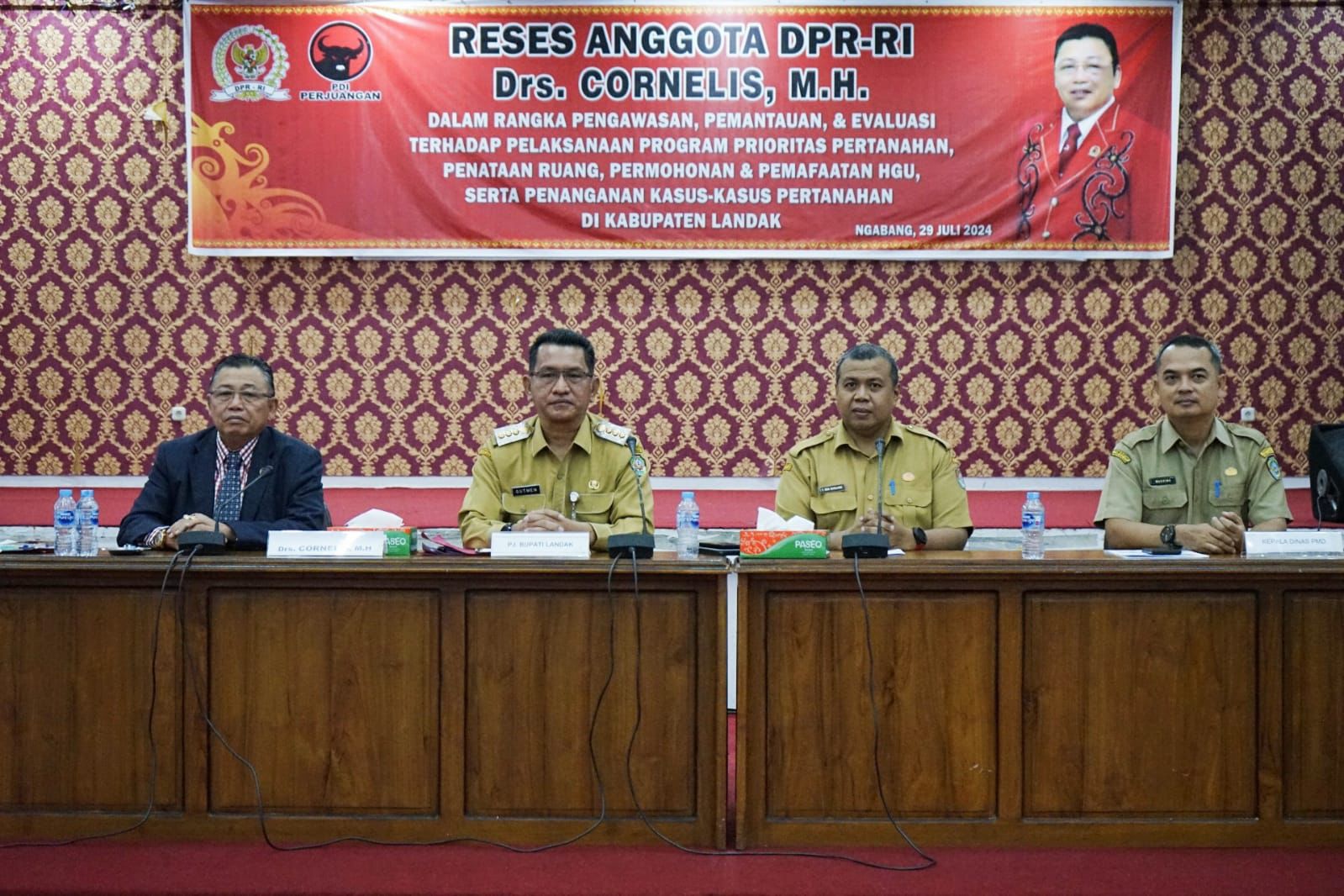 LANDAK – Pj. Bupati Landak Gutmen Nainggolan mengapresiadi giat reses Anggota DPR-RI Cornelis yang dilaksanakan di Aula Kantor Bupati Landak, Senin (29/07/2024).