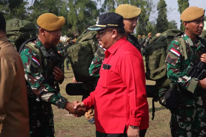 LANDAK – Ketua Dewan Perwakilan Rakyat Daerah (DPRD) Kabupaten Landak Heri Saman menghadiri upacara pemberangkatan personel Yonarmed 16/Tumbak Kaputing dalam rangka satuan tugas pengamanan perbatasan Republik Indonesia – Malaysia, Kalimantan Barat Sektor Barat, Senin (29/05/2023).