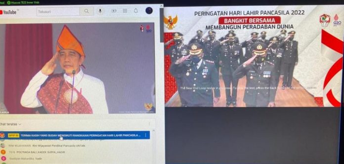 LANDAK- Kapolres Landak AKBP Stevy Frits Pattiasina menghadiri upacara Peringatan Hari Lahir Pancasila yang dilaksanakan secara virtual di ruang Monitoring Center Polres Landak, Rabu (1/6/2022)