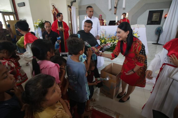 LANDAK– Bupati Landak periode 2017-2022 Karolin Margret Natasa menghadiri perayaan dan misa 11 tahun Paroki Santo Fransiskus Asisi Pakumbang sekaligus penerimaan sakramen krisma oleh Uskup Agung Pontianak Monsinyur Agustinus Agus di Gereja Santo Fransiskus Asisi, Desa Pakumbang, Kecamatan Sompak, Kabupaten Landak, minggu (16/04/2023).