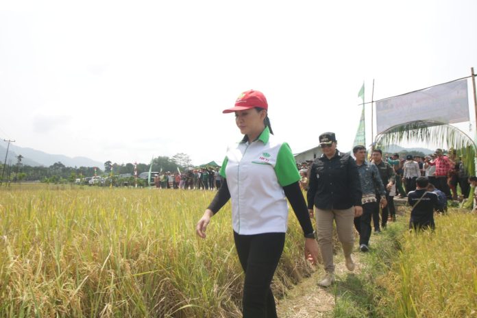 LANDAK– Ketua Himpunan Kerukunan Tani Indonesia (HKTI) Kabupaten Landak Karolin Margret Natasa bersama Penjabat (Pj) Bupati Landak Samuel melakukan panen raya padi lahan Kelompok Tani (Poktan) Pandan Permai Dusun Simpang Pandan, Desa Tiang Tanjung, Kecamatan Mempawah Hulu dengan menghasilkan produksi padi 5,7 ton untuk 1 hektare lahannya. jum’at (14/04/2023).