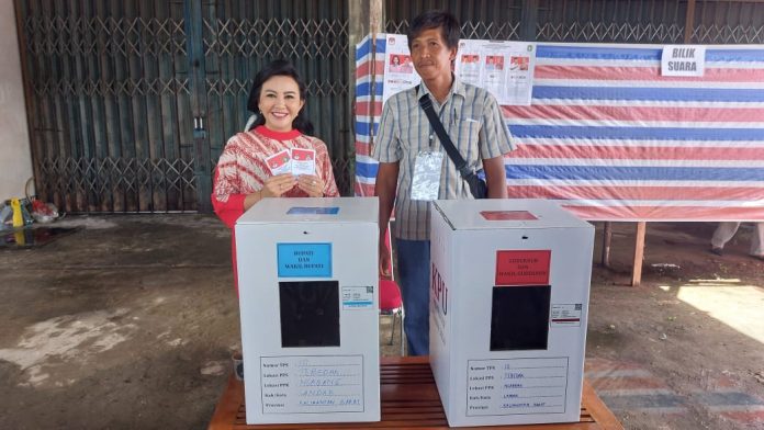 LANDAK – Calon Bupati Landak nomor urut 1 Karolin Margret Natasa menyalurkan hak pilihnya pada Pemilihan Kepala Daerah (Pilkada) serentak di Tempat Pemungutan Suara (TPS) 10, Dusun Dengoan, Desa Tebedak, Kecamatan Ngabang, Kabupaten Landak, Rabu (27/11/2024).