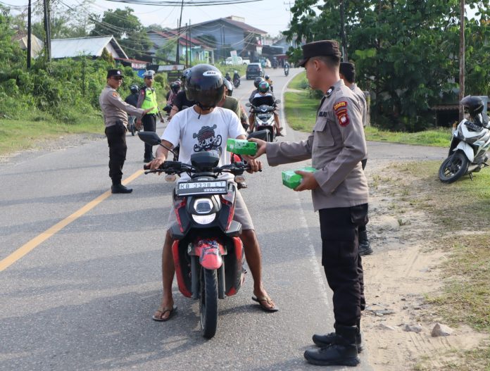 LANDAK – Kasat Reserse Narkoba Polres Landak IPTU Asep Tabroni bersama sejumlah anggota Polres Landak membagikan takjil gratis kepada para pengguna jalan yang melintas di depan Mapolres Landak, Rabu (12/04/2023).