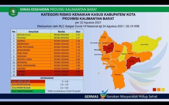 LANDAK- Berdasarkan data yang dikeluarkan BLC Satgas Covid-19 nasional pada 24 Agustus 2021 Kabupaten Landak masuk dalam zona merah penyebaran Covid-19.