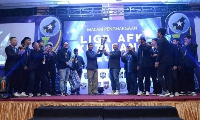 KETAPANG- Wakil Bupati Ketapang Farhan, dan Sekretaris Daerah Kabupaten Landak Alexander Wilyo tampak kompak mengangkat piala juara 1 Liga Futsal Ketapang (AFK) pada malam penghargaan Asosiasi Futsal Ketapang, Kamis (1/9/2022) malam di salah satu Hotel di Ketapang.