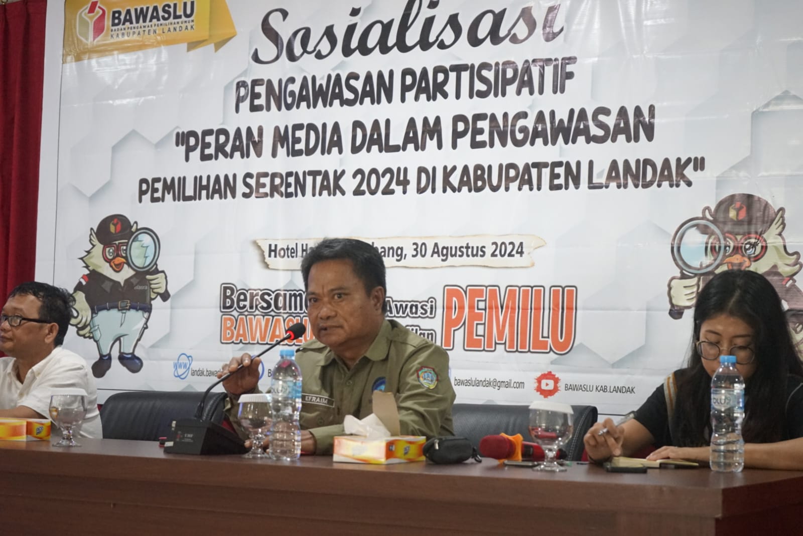 LANDAK – Plt. Kepala Dinas Komunikasi dan Informatika Kabupaten Landak Efraim Pata’Allorante, menjadi narasumber kegiatan sosialisasi pengawasan partisipatif “Peran Media Dalam Pengawasan Pemilihan Serentak 2024″, di Aula Hotel Hanura Kecamatan Ngabang Kabupaten Landak, Jumat (30/08/2024).