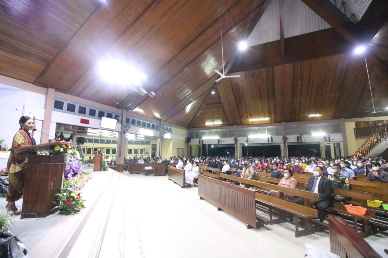 LANDAK – Bupati Landak Karolin Margret Natasa bersama suami dan keluarga mengikuti misa malam natal di gereja salib suci ngabang, bersama dengan ummat katolik yang ikut melaksanakan misa malam natal. Perayaan misa malam natal tahun 2021 di Kabupaten Landak masih dalam suasana Pandemi COVID-19 sehingga mengharuskan pelaksaan ibadah secara protokol kesehatan.