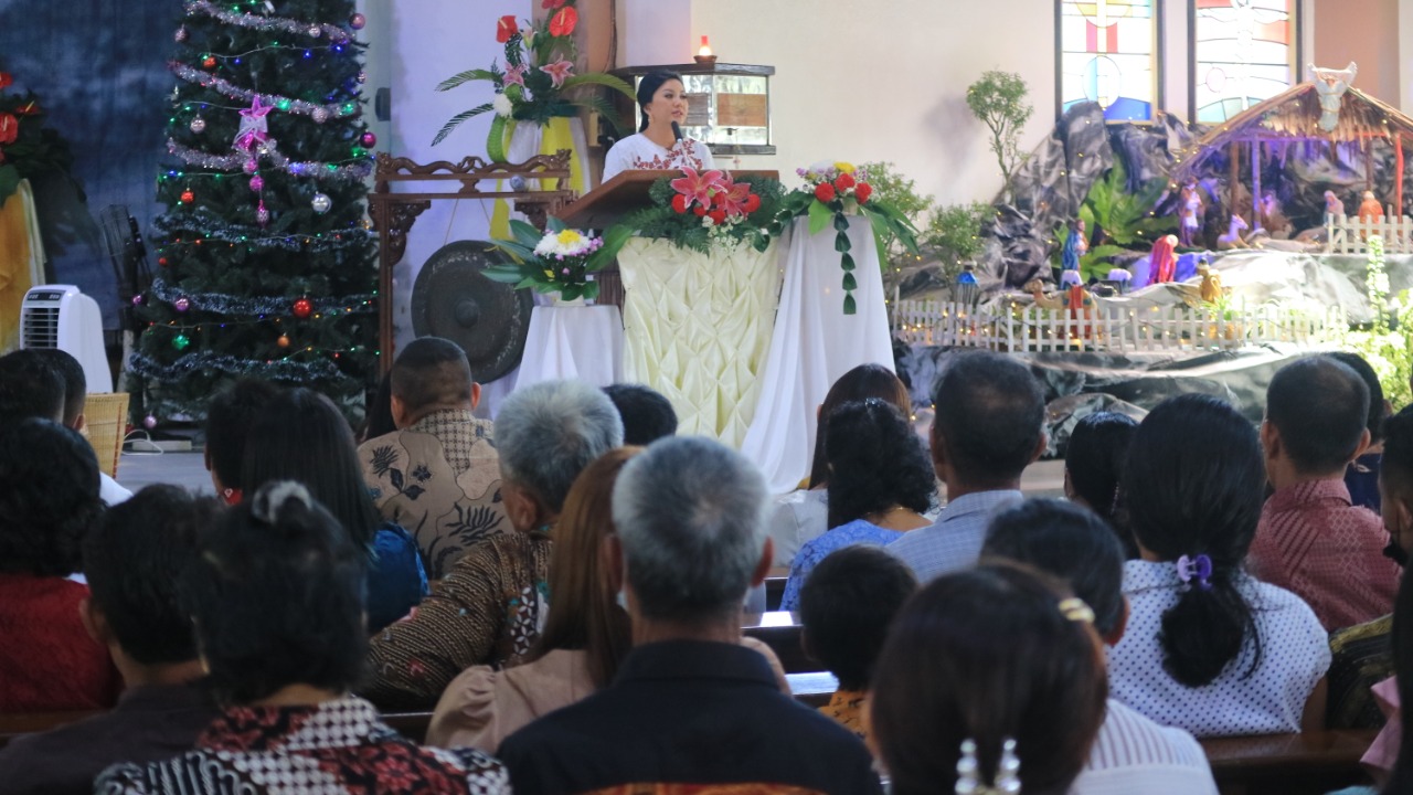 LANDAK – Bupati Landak periode 2017-2022 Karolin Margret Natasa bersama suami dan Anggota Dewan Perwakilan Rakyat Republik Indonesia (DPR RI) Fraksi Partai Demokrasi Indonesia (PDI) Perjuangan Daerah Pemilihan Kalimantan Barat 1 Cornelis bersama istri mengikuti misa hari raya natal di Gereja Salib Suci Ngabang yang dipimpin oleh Pastor Filipus dan berlangsung secara aman dan hikmat dengan dihadiri ribuan umat katolik yang berada di wilayah Paroki Salib Suci Ngabang, Kecamatan Ngabang, Kabupaten Landak, minggu (25/12/2022).