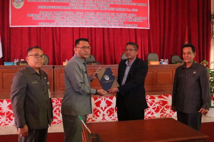 LANDAK – Dewan Perwakilan Rakyat Daerah (DPRD) Kabupaten Landak bersama Pemerintah Kabupaten Landak menggelar rapat paripurna ke 8 masa sidang III Tahun 2024 dengan agenda penyampaian pendapat akhir fraksi-fraksi terhadap raperda tentang Pertanggungjawaban Pelaksanaan APBD Tahun Anggaran 2023 yang dilaksanakan di aula Kantor DPRD Landak, Rabu (26/06/2024).