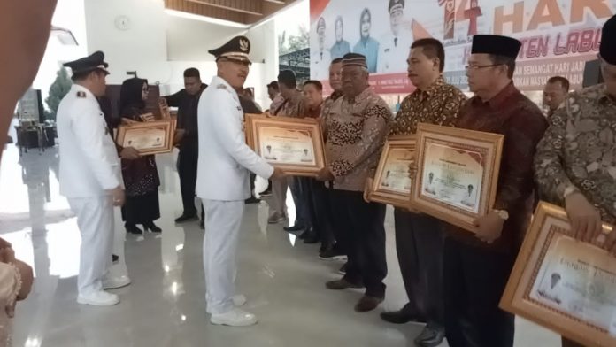 SUMATRA UTARA- Bupati Labuhanbatu Selatan Edimin menyerahkan piagam penghargaan kepada sejumlah tokoh pemekaran Kabupaten Labuhanbatu Selatan pada Kamis (21/07/2022).
