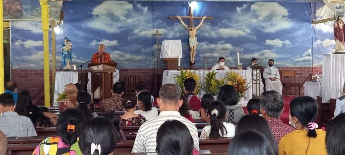 LANDAK- Pj Bupati Landak Samuel menghadiri misa di Gereja ST Yohanes Pemandi Pahuman, Kecamatan Sengah Temila, Kabupaten Landak Minggu (12/6/2022).