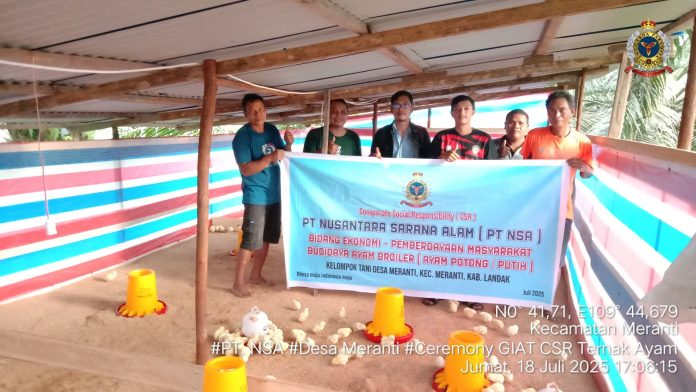 LANDAK – PT Nusantara Sarana Alam (NSA), anak perusahaan dari PT Sampoerna Agro, menunjukkan komitmennya terhadap pemberdayaan masyarakat melalui program Corporate Social Responsibility (CSR). Pada Jumat (18/07/2025), PT NSA menyerahkan bantuan bibit ayam broiler beserta perangkat ternak kepada Kelompok Meranti Jaya Abadi di Desa Meranti, Kabupaten Landak.