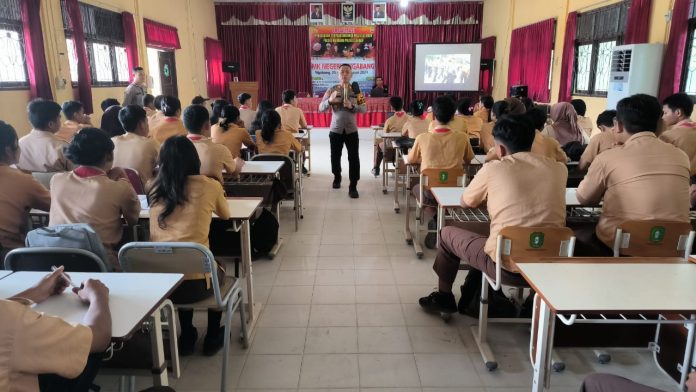 LANDAK – Kapolsek Ngabang AKP Pramudi didampingi anggota mengunjungi SMKN 1 dan SMA Negeri 1 Ngabang dalam rangka mensosialisasikan penerimaan anggota Polri Tahun Anggaran 2024, Jum’at (02/02/2024).