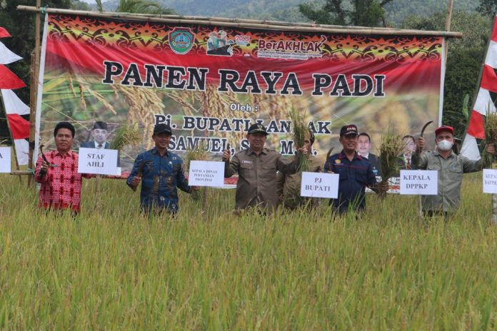 LANDAK – Pj. Bupati Landak Samuel menghadiri panen raya padi serta menyerahkan alat mesin pertanian dan santunan perlindungan jaminan sosial Ketenagakerjaan di Dusun Simpang Pandan, Desa Tiang Tanjang, Kecamatan Mempawah Hulu, Kabupaten Landak, Jum’at (14/04).