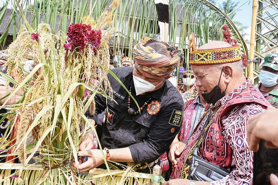 KETAPANG- Sekretaris Daerah Kabupaten Ketapang Alexander Wilyo yang juga Patih Jaga Pati Kerajaan Hulu Aik menghadiri kegiatan Adat Bejujokng atau syukuran atas datangnya musim panen padi Desa Gemma, Dusun Gerai Kecamatan Simpan Dua Tahun 2022, Kamis (17/03/2022).