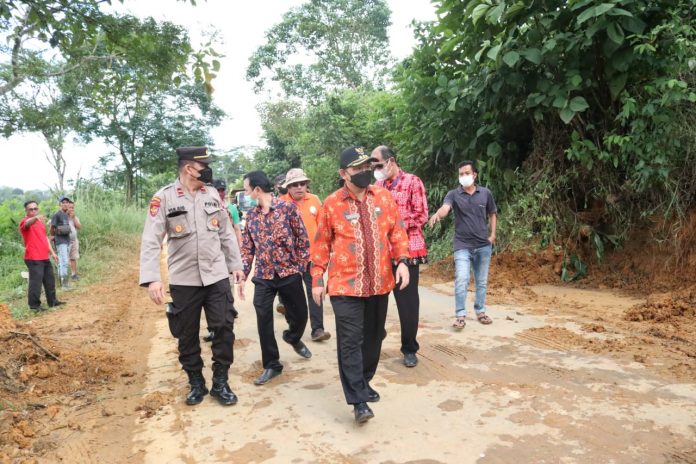 SENGAH TEMILA- Pj Bupati Landak Samuel meninjau langsung proses pembersihan sisa material tanah longsor yang sempat menutupi Jalan Raya Ngabang-Pontianak di Dusun Bintang, Desa Pahauman, Kecamatan Sengah Temila, Kabupaten Landak, Jumat (24/6/2022).