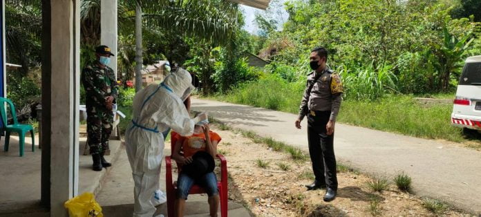 MEMPAWAH HULU- Tim medis Puskesmas Karangan melakukan pelacakan terhadap kontak erat warga Dusun Pandan, Desa Tiang Tanjung yang terkonfirmasi positif Covid-19.