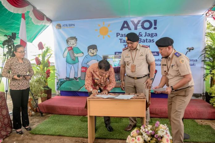 KETAPANG – Wakil Bupati Ketapang Farhan menerima 58 sertifikat aset Pemerintah Daerah Kabupaten Ketapang saat mengikuti Gerakan Masyarakat Pemasangan Tanda Batas (GEMAPATAS) secara daring yang dilaksanakan di Kelurahan Banjar, Kabupaten Ketapang pada Jum’at (03/02).