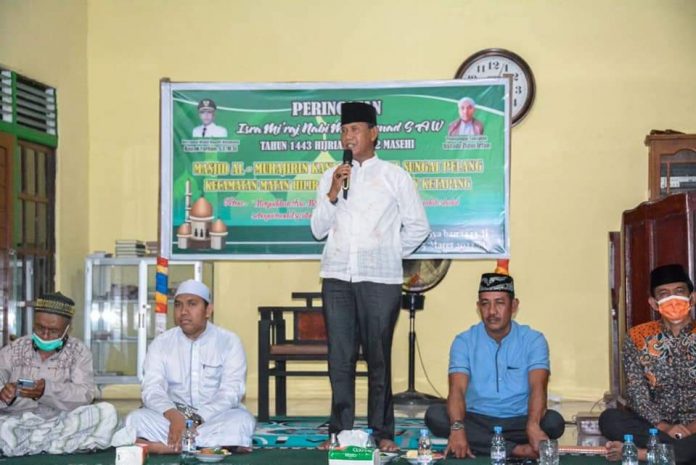 KETAPANG- Wakil Bupati Ketapang Farhan didampingi Istri Ervani Masita Farhan menghadiri peringatan Isra’ Mi’raj Nabi Muhammad SAW 1443 H bertempat di Masjid Al- Muhajirin Kanalisasi Desa Sungai Pelang, Sabtu (05/03/2022).