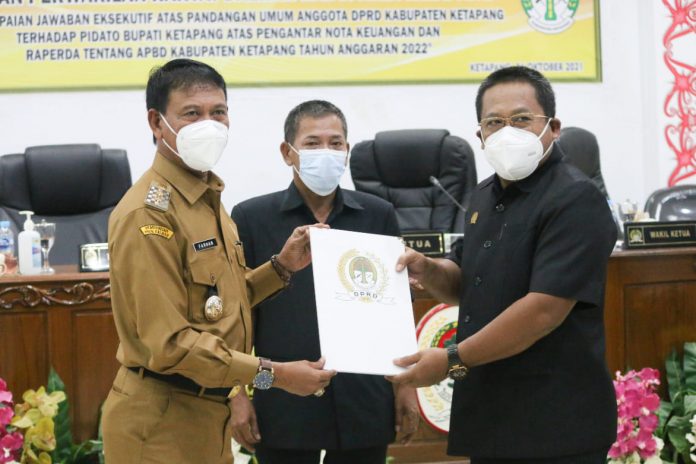 KETAPANG- Wakil Bupati Ketapang Farhan menghadiri rapat paripurna DPRD Ketapang terkait Penyampaian Jawaban Eksekutif Atas Pandangan Umum Anggota DPRD Kabupaten Ketapang Terhadap Pidato Bupati Ketapang Atas Pengantas Nota Keuangan dan Raperda Tentang APBD Kabupaten Ketapang Tahun Anggatan 2022 Selasa (26/10/2021).