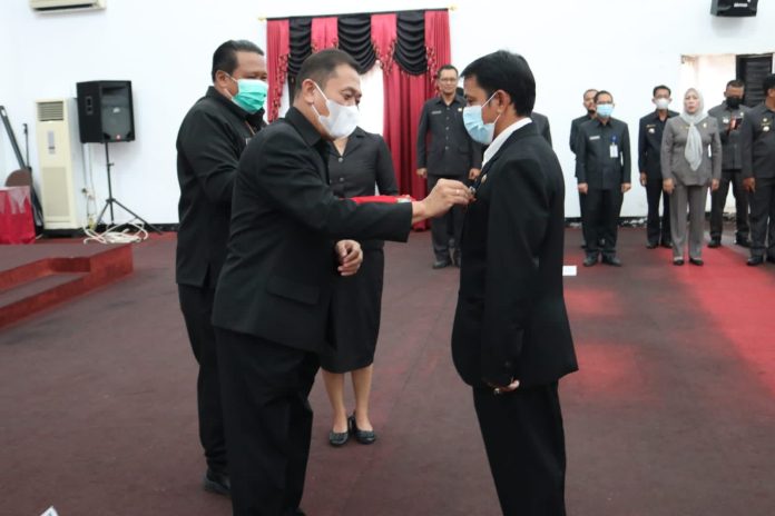 LANDAK – Sekretaris Daerah Kabupaten Landak Vinsensius menyematkan penganugrahan tanda kehormatan Satyalencana Karya Satya (SLKS) ke XXX, XXX dan X dari Presiden Republik Indonesia bagi Pegawai Negeri Sipil di lingkungan Pemerintah Kabupaten Landak Tahun 2022 yang dilaksanakan di Aula Kantor Bupati Landak, Selasa (13/12/2022).