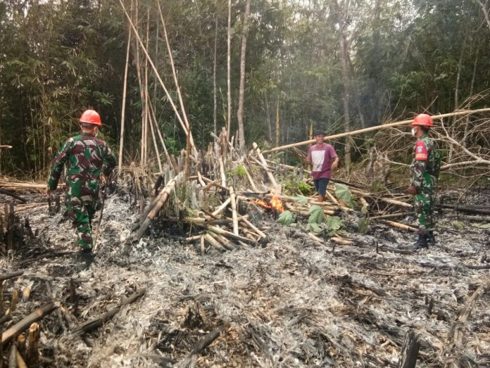 SENGAH TEMILA- Anggota Koramil 1201-09/Sengah Temila melakukan pengawasan dan pemetaan pembukaan lahan dengan metode pembakaran di Dusun Tebing Tinggi, Desa Sidas, Kecamatan Sengah Temila Kabupaten Landak Jum’at (8/10/2021).