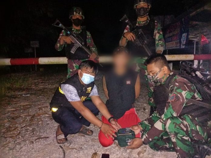 BENGKAYANG- LAW (22) diamankan Anggota Satgas Pamtas Yonif Mekanis 643/Wns Pos Komando Utama (Kout) saat melintas didepan Pos Dalduk Kout yang berada dititik nol perbatasan RI-Malaysia Desa Jagoi Babang, Kecamatan Jagoi Babang, Kabupaten Bengkayang Selasa (19/4) sekitar pukul 22.45 WIB.