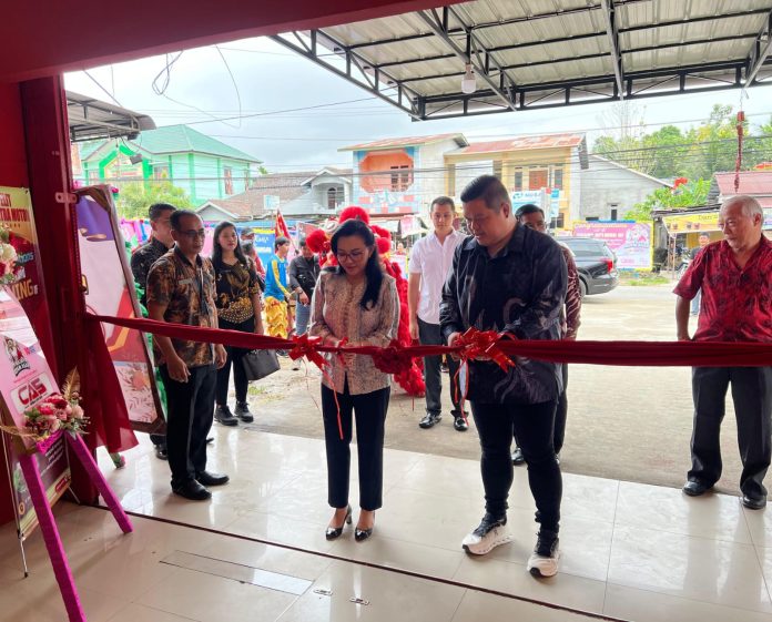 LANDAK – Bupati Landak, Karolin Margret Natasa, bersama Wakil Bupati Landak, Erani, menghadiri Grand Opening rumah makan Raja Ayam Asap di Dusun Tungkul, Desa Hilir Kantor, Kecamatan Ngabang, Kamis (10/07/25). Acara ditandai dengan pemotongan pita oleh Bupati Karolin dan penyalaan petasan sebagai simbol peresmian.