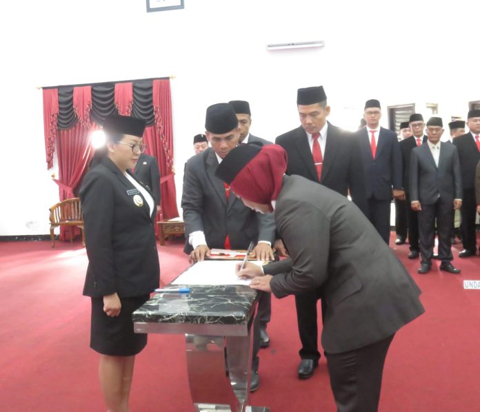 LANDAK – Bupati Landak, Karolin Margret Natasa, melantik dan mengambil sumpah jabatan 61 pejabat pimpinan tinggi pratama, administrator, dan pengawas di lingkungan Pemerintah Kabupaten Landak. Acara pelantikan berlangsung di Aula Kantor Bupati Landak, Selasa (4/11/2025).