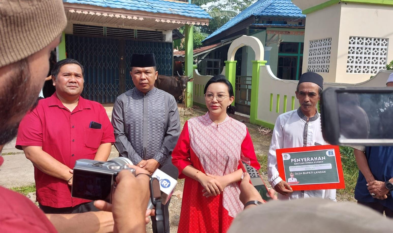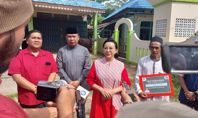 LANDAK – Bupati Landak, Karolin Margret Natasa, menyerahkan secara langsung bantuan hewan kurban dari Pemerintah Kabupaten Landak kepada jemaah Masjid Babul Hafadzah di Pasar Jati, Jumat (6/6/2026).