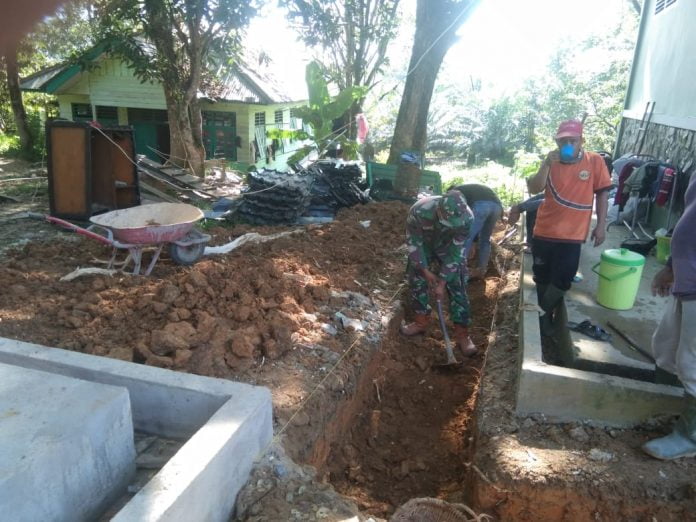 SANGGAU- Anggota Zidam XII/Tanjungpura Sertu Sudarsono turun langsung dalam membantu pembangunan fasilitas umum yang berada di wilayah perbatasan.