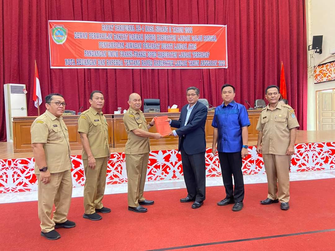 LANDAK – Dewan Perwakilan Rakyat Daerah (DPRD) Kabupaten Landak menggelar rapat paripurna ke-4 Masa Sidang II Tahun 2022 dalam rangka Penyampaian Jawaban Penjabat Bupati Landak atas Pandangan Umum Fraksi-Fraksi DPRD Kabupaten Landak Terhadap Nota Keuangan dan RAPERDA tentang RAPBD Kabupaten Landak Tahun Anggaran 2023. Senin, (21/11/2022)