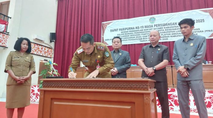 LANDAK – Dewan Perwakilan Rakyat Daerah (DPRD) Kabupaten Landak menggelar rapat paripurna ke-19 masa persidangan III Tahun 2025 dengan agenda penandatanganan nota kesepahaman Kebijakan Umum Anggaran (KUA) dan Prioritas Plafon Anggaran Sementara (PPAS) APBD 2025, Senin (22/9/2025).
