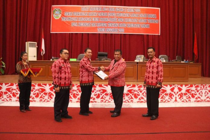 Rapat tersebut dilaksanakan dalam rangka penyampaian Pandangsn Umum Fraksi-Fraksi DPRD Landak terhadap Nota Keuangan dan Raperda tentang RAPBD Kabupaten Landak Tahun Anggaran 2023.